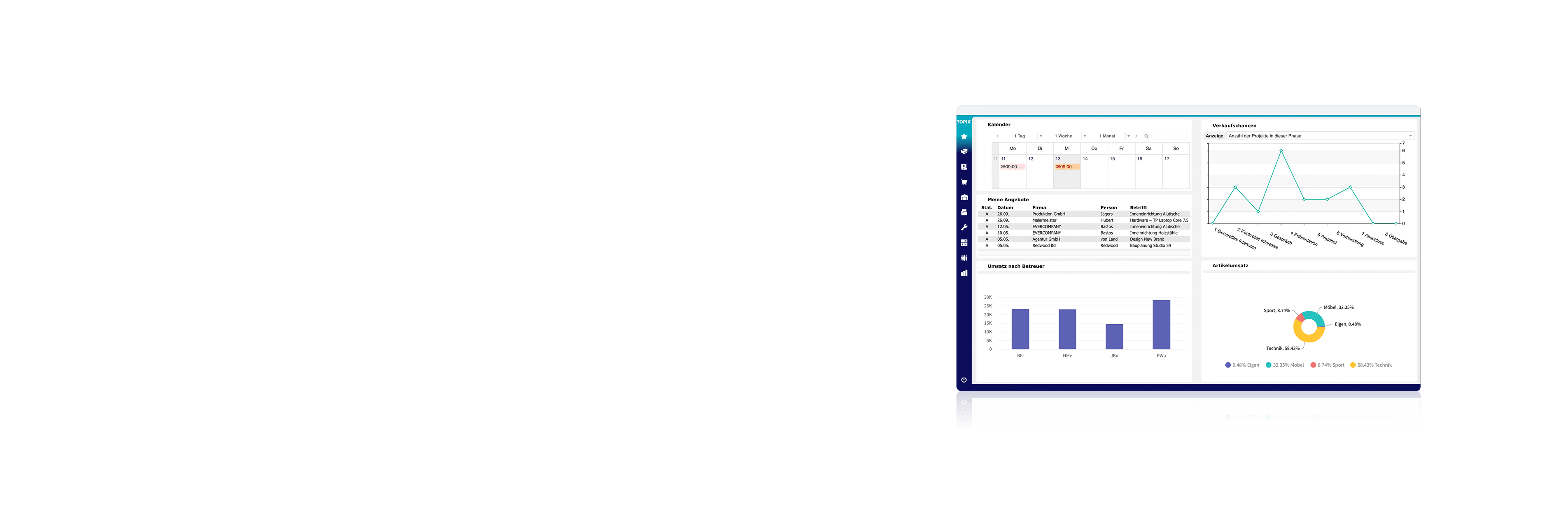 TOPIX vereint alle Unternehmensbereiche in einem System: CRM, DMS, Waren- und Materialwirtschaft, Finanzen und HR. So werden Ihre Daten sofort unternehmensweit transparent und lassen sich auf Knopfdruck bereichsübergreifend auswerten.
