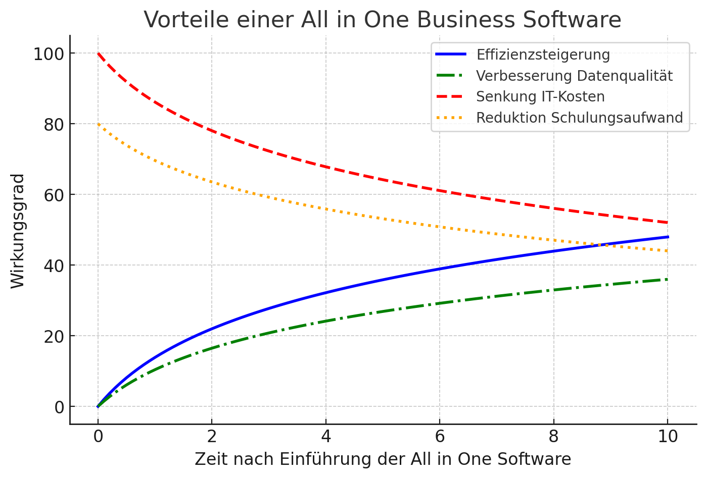 Schematische Darstellung der Vorteile einer All in One Business Software in einem Koordinatensystem mit Trendlinien: Effizienzsteigerung (blaue Linie), Verbesserung der Datenqualität (punktierte grüne Linie mit Strichen), Senkung der IT-Kosten (gestrichelte rote Linie), Reduktion des Schulungsaufwands (gepunktete gelbe Linie)