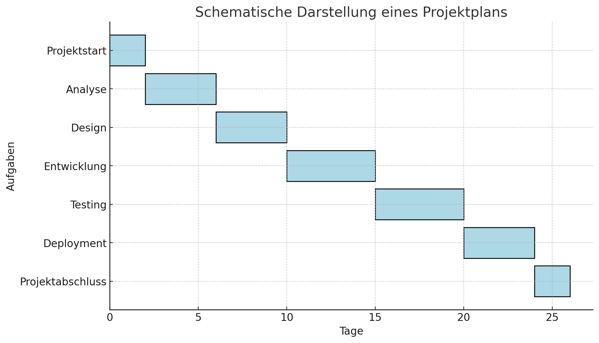 Der Projektplan ist eine zeitliche Planung des Projekts, der die einzelnen Aufgaben und Meilensteine über den gesamten Projektzeitraum hinweg abbildet. Er zeigt, wann welche Aufgaben erledigt werden müssen, wer verantwortlich ist und wie lange einzelne Phasen dauern. Er beantwortet die Frage "Wann wird was erledigt?". Ein Gantt-Diagramm ist eine typische Darstellungsform eines Projektplans. Ein typischer Projektplan enthält: