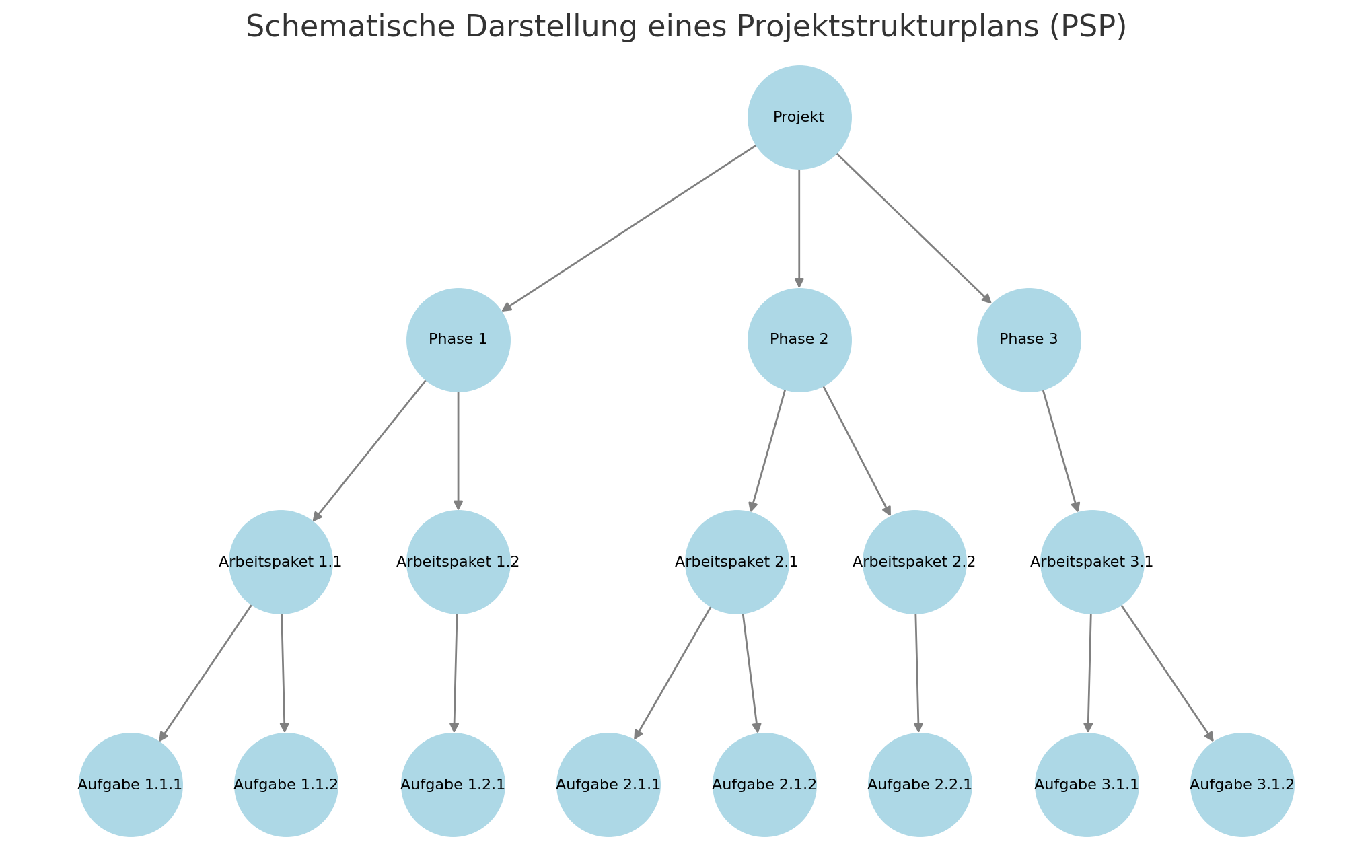 Schematische Darstellung eines Projektstrukturplans (PSP). Die Grafik zeigt die hierarchische Aufteilung eines Projekts in Phasen, Arbeitspakete und Aufgaben, was die Strukturierung und Planung erleichtert.