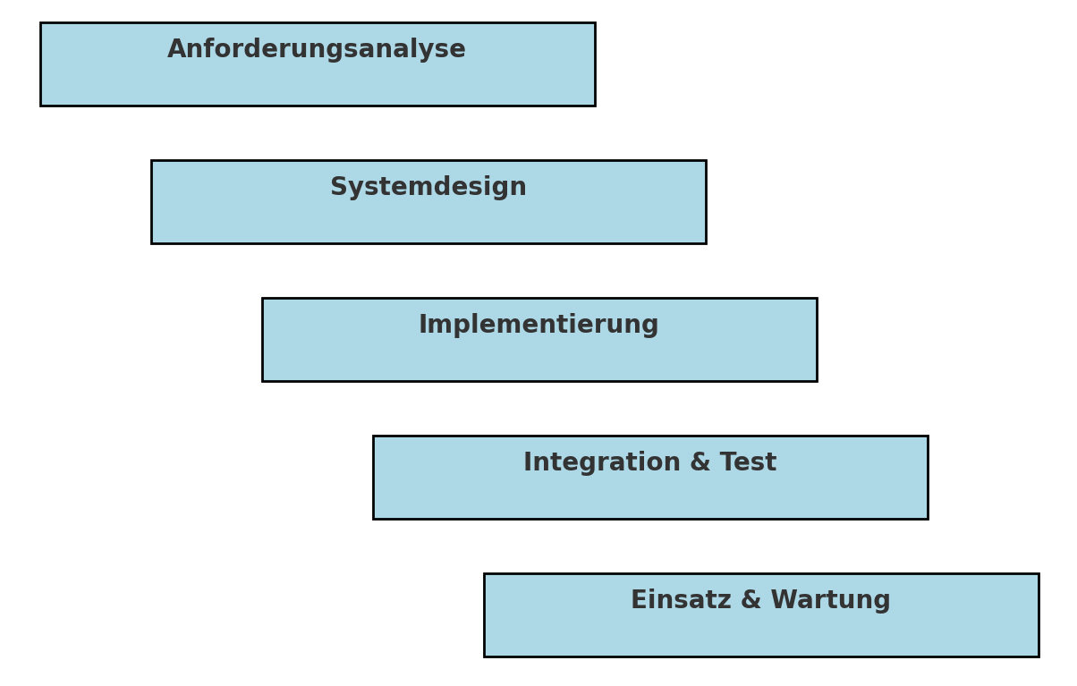 Schematische Darstellung des Wasserfallmodells, die die sequentielle Abfolge der klassischen Projektmanagement-Phasen visualisiert. Die Grafik zeigt die klar definierten Stufen von Anforderungsanalyse bis Einsatz & Wartung und verdeutlicht den schrittweisen Fortschritt im Projekt.