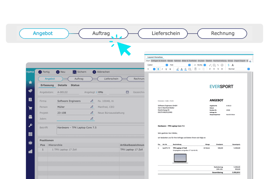 Schnelle Angebotserstellung und mit einem Klick Auftrag, Lieferschein und (E-)Rechnung generieren.