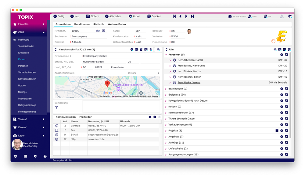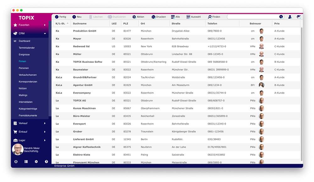 Die zentrale Adressverwaltung von TOPIX dient primär der Erfassung von Firmendaten. Dabei spielt es keine Rolle ob diese Firmen Kunden oder Lieferanten sind – beide werden auf die gleiche Art und Weise verwaltet. Einer Firma können Sie beliebig viele Personen, Korrespondenz, Termine, Projekte, Kategorien, etc. zuordnen.