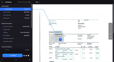 Rossum besteht aus vier Schlüsselkomponenten: einer innovativen KI-Engine, einer intuitiven Validierungs-Benutzeroberfläche, einer leistungsstarken Berichts-Engine und einer erstklassigen Erweiterungsumgebung. Die Cloud-Lösung von Rossum ist sofort einsatzbereit. Damit sparen Sie Zeit und Kosten und erhalten einen schnellen ROI. Reduzieren Sie Ihren manuellen Aufwand und rationalisieren Sie Ihre Prozesse.